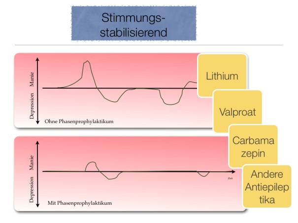 Lithium gehört zu den am häufigsten verordneten Medikamenten weltweit. Etwa jeder tausendste Erdenbürger nimmt Lithium ein. Lithium gilt als das wirkstärkste Phasenprophylaktikum, das heißt, dass bipolare Patienten unter einer Behandlung mit Lithium weniger häufig und weniger stark ausgeprägte manische und depressive Episoden erleiden. Die Grafik zeigt die erwartbare Wirkung von Lithium und anderen Phasenprophylaktika auf die Stimmung. Ich selbst glaube, dass Lithium tatsächlich wirkstärker ist als andere Phasenprophylaktika.