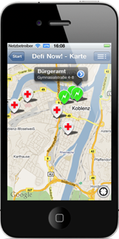 Wenn man reanimieren muss, dann erhöht man die Wahrscheinlichkeit eines Erfolges dramatisch, wenn man zügig einen Defibrillator einsetzt. Dafür muss man eben gerade nicht Arzt sein, mit einem der inzwischen immer öfter im öffentlichen Raum anzutreffenden automatischen Defibrillatoren (Automatischer Externer Defibrillator: AED) können auch Laien genau diesen Vorteil für die Patienten erreichen. Wenn die Reanimation aufgrund eines Kammerflimmerns erforderlich ist, fällt die Wahrscheinlichkeit, jemanden erfolgreich zu reanimieren, etwa um 10% pro Minute, in der nicht adäquat geholfen wird. Die entscheidende Hilfe beim Kammerflimmern ist neben der kardiopulmonalen Reanimation die frühzeitige Defibrillation. Dafür braucht man aber nun einen Defi. Den kann man unter 112 bestellen, dann auch gleich mit Bedienung; aber manchmal ist man mit einem halbautomatischen Defi, den Laien bedienen können und sollen, einfach schneller. Wenn sich der Defi im Umkreis von 100 Metern um den Notfall herum befindet, ist es auch wirklich hilfreich, diesen herbei zu schaffen. Im ländlichen Raum, wo der Notarzt länger braucht, um zu kommen, auch in einem weiteren Radius. Nun gibt es eine Smartphone-App, die anzeigt, wo sich der nächste Defi befindet: Entweder Def_Now im App Store laden oder unter http://definow.org die App für Android finden.