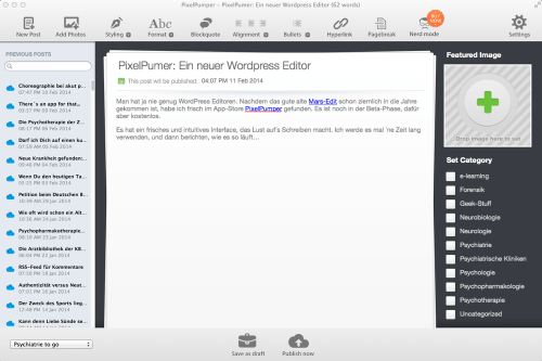 Man hat ja nie genug WordPress Editoren. Nachdem das gute alte Mars-Edit schon ziemlich in die Jahre gekommen ist, und das Schweizer-Messer Byword zwar Text gut publishen kann, aber keine Bilder verarbeitet (außer in der markdown-Syntax, aber dann muss das Bild anders zu WordPress hochgeladen werden), habe ich frisch im Mac-App-Store PixelPumper gefunden. Es ist noch in der Beta-Phase, dafür aber kostenlos.