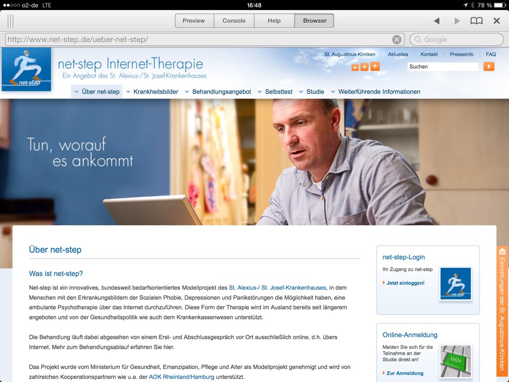 Das Projekt heißt net-step und richtet sich aktuell an Patienten, die unter einer sozialer Phobie, einer Depressionen oder einer Panikstörung leiden. Auf der homepage gibt es einen kurzen Film dazu, den man sich bei Interesse an dem Thema angucken sollte. Im Projekt net-step wird gegenwärtig wechselseitig über getippte Text kommuniziert, es findet also kein Video-Telefonat wie bei Skype statt.