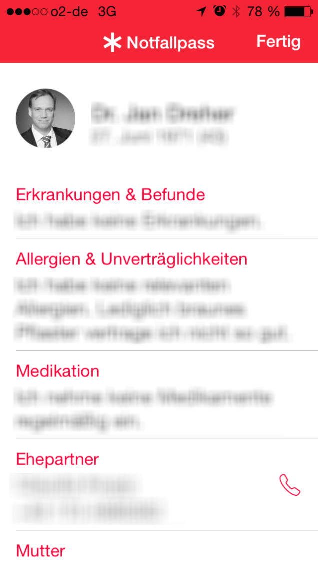 Finde ich wirklich praktisch. Insbesondere Kontaktpersonen für den Notfall, aber auch die Medikation hilft sehr. Man kann die Felder auch für weiterführende Informationen wie etwa den Hinweis auf eine Behandlungsvereinbarung oder ähnliches verwenden. Sehr sinnvoll ist natürlich auch das Feld „Organspender“. Ich denke, mit den Handys kann sich hier eine größere Verbreitung ergeben als mit den Organspendeausweisen.