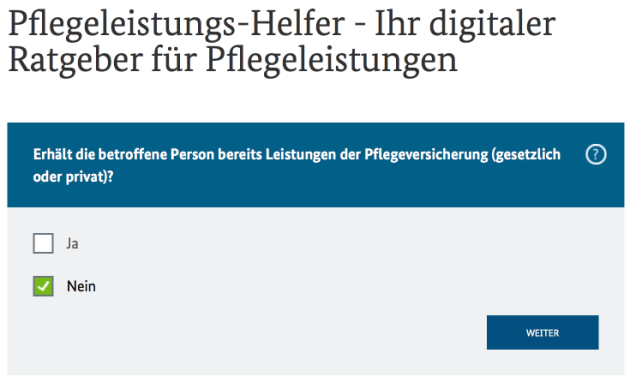 Das Bundesgesundheitsministerium hat eine Online-Information erstellt, mit der man durch einige interaktive Fragen prüfen kann, ob und wenn ja welche Pflegeleistungen für einen in Betracht kommen und wo man sie beantragen kann.