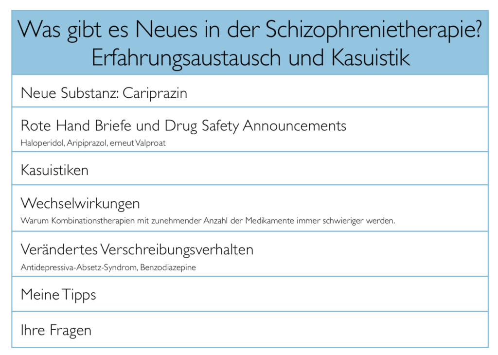 Nächste Mittwoch, den 18.September, halte ich um 16:00 einen Vortrag zum Thema „Was gibt es Neues in der Schizophrenietherapie?“ Es wird ein Erfahrungsaustausch mit Klinikärzten und Niedergelassenen. Die Veranstaltung findet statt in den Veranstaltungsräumen des Vereinsheim tv1848, Bökelstraße 63 in 41063 Mönchengladbach. Die Veranstaltung wird unterstützt von Recordati.