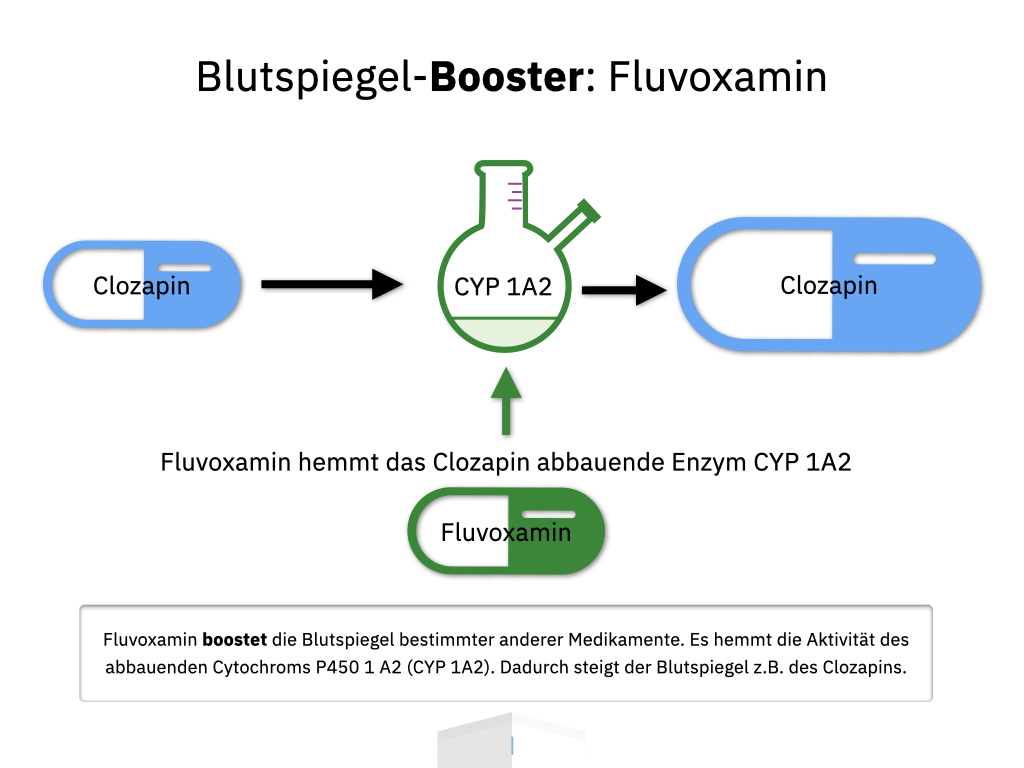 Ich habe hier mal die beiden grundlegenden pharmakokinetischen Prinzipien in zwei einfachen Grafiken dargestellt. Dabei habe ich in der ersten Grafik das Prinzip dargestellt, dass ein Medikament, hier Fluvoxamin, den Blutspiegel eines anderen Medikamentes, hier Clozapin, erhöhen kann, und das habe ich Blutspiegel-Booster genannt und die ganze Sache grün gefärbt, weil das Ergebnis, das uns interessiert, ein erhöhter Blutspiegel ist. Traditionell wird dieses Beispiel mit der Überschrift Cytochrom P450-Inhibitoren überschrieben, und Inhibitoren klingt nach weniger. Es ist auch weniger Aktivität des abbauenden Enzyms, aber das ist für uns ja völlig uninteressant, uns interessiert ja nur der resultierende Blutspiegel des zweiten Medikamentes, und der geht natürlich nach oben. Daher grün und Booster.