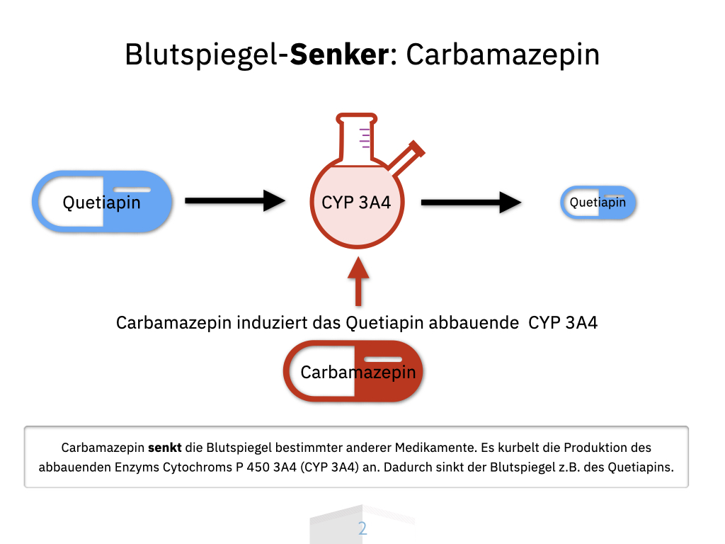 Die zweite Abbildung zeigt das andere Beispiel, die Senkung eines Blutspiegels, hier von Quetiapin, durch ein anderes Medikament, hier Carbamazepin. Ich habe Carbamazepin also Senker genannt und die Grafik rot gefärbt. Traditionell wird dieses Kapitel mit der Überschrift Cytochrom P450 Induktion überschrieben, und man denkt an mehr. Aber auch hier interessiert nicht, dass es mehr Aktivität des abbauenden Enzyms gibt, sondern, dass der Blutspiegel des zweiten Medikamentes eben gerade sinkt.