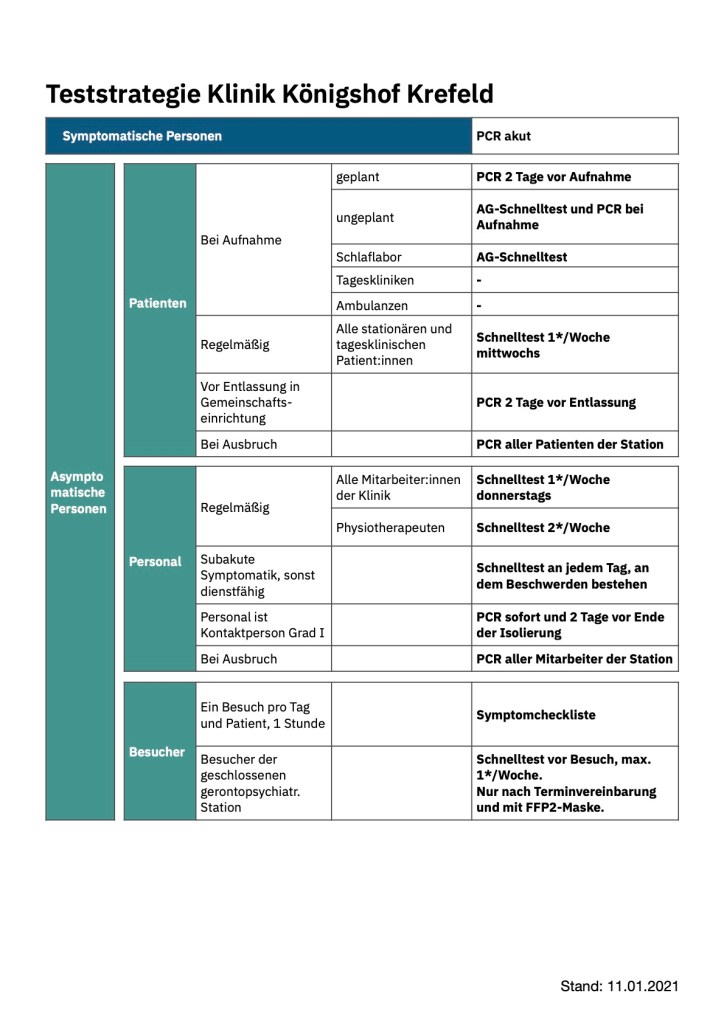 Seit Ende Dezember testen wir in der Klinik Königshof Krefeld alle Mitarbeiter:innen einmal wöchentlich jeweils donnerstags und alle Patient:innen sowohl im stationären Bereich als auch im tagesklinischen Bereich ebenfalls einmal wöchentlich jeweils mittwochs.