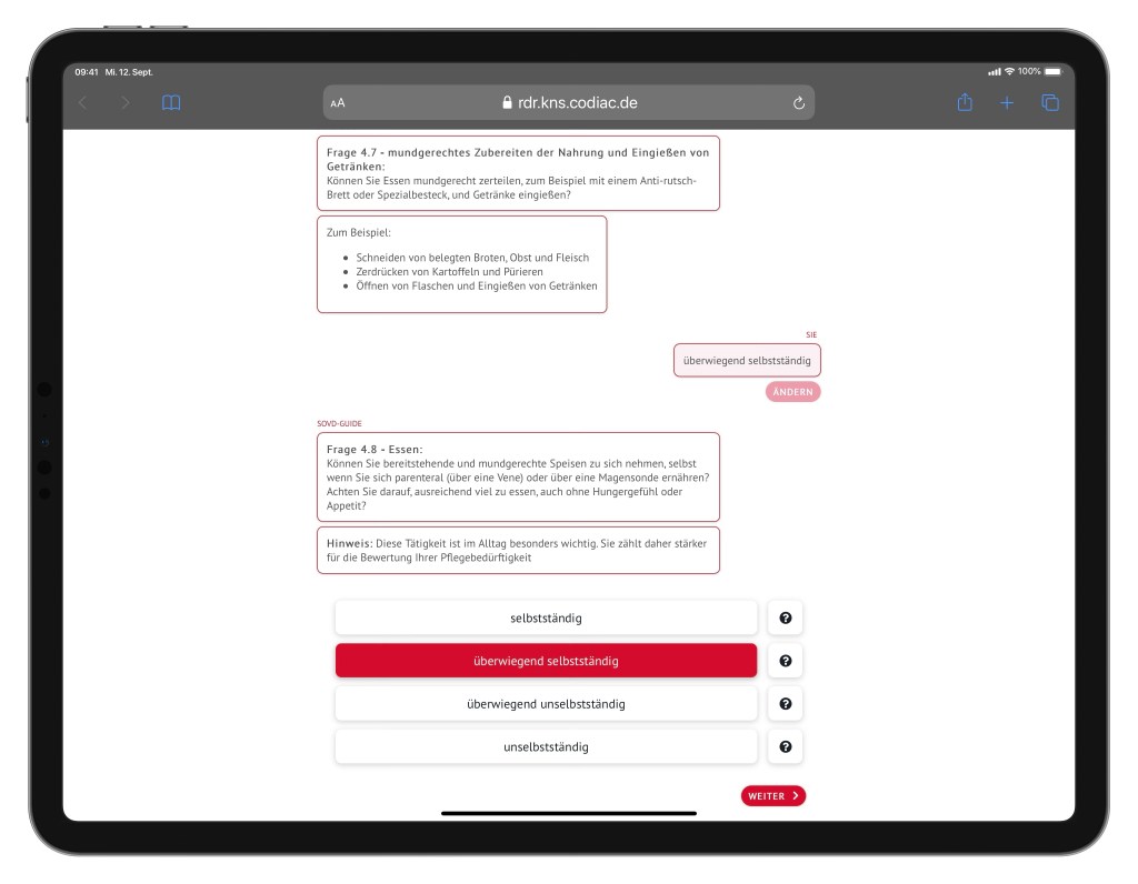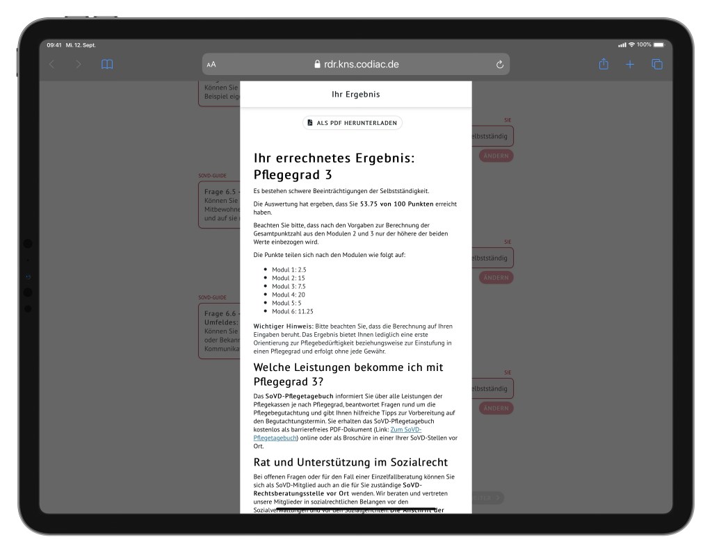 Der Sozialverband Deutschland (SoVD) hat einen Online-Pflegegradrechner erstellt. Das Tool geht 6 Module interaktiv durch und zeigt am Schluss eine Einschätzung, mit welchem Pflegegrad zu rechnen ist. Die tatsächliche Einschätzung des Gutachters kann natürlich hiervon abweichen, zur Vorbereitung und eigenen Einschätzung des Pflegegrades ist dies aber ein sehr gutes Tool. Am Schluß erhält man eine Auswertung und Erklärung des zu erwartenden Pflegegrades. Sehr praktisch!