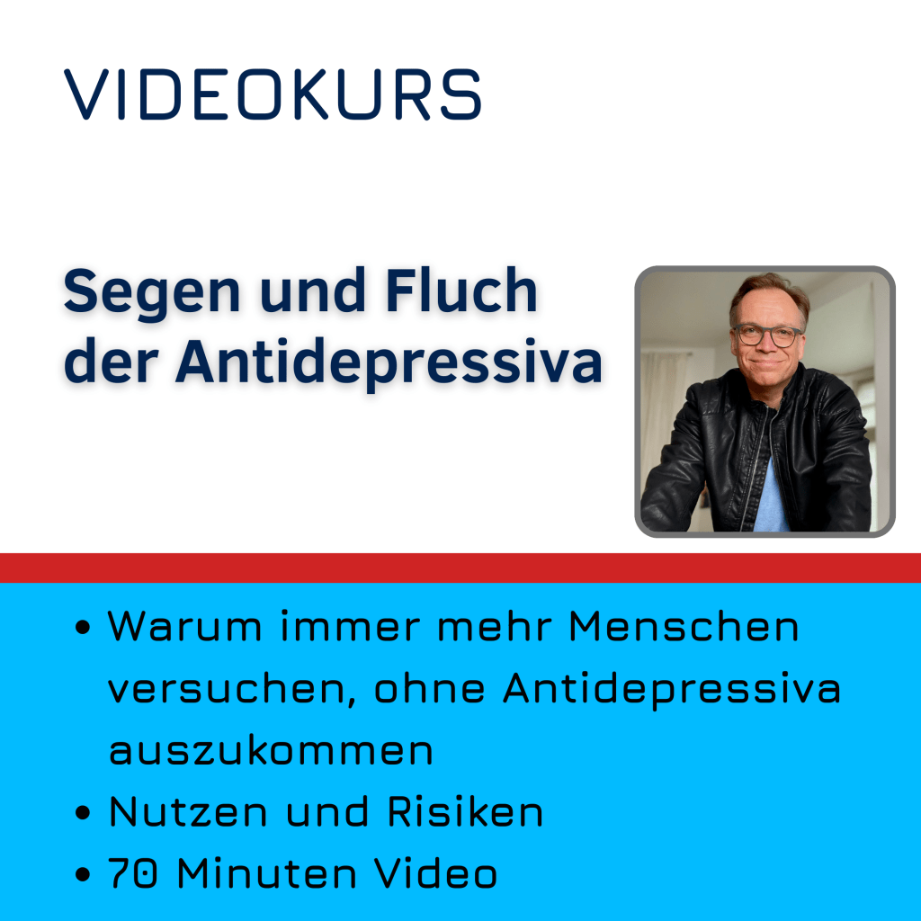 In meinem Videokurs „Segen und Fluch der Antidepressiva“ erkläre ich deren Nutzen in den verschiedenen Indikationen, beschreibe aber auch die Risiken, Nebenwirkungen und Komplikationen, die die Einnahme von Antidepressiva verursachen kann. Am Ende des über 70-minütigen Videokurses kannst Du für Dich selbst die Vor- und Nachteile einer Medikation mit Antidepressiva besser einordnen. Eine konkrete Beratung im Einzelfall gebe ich mit diesem Kurs natürlich nicht.