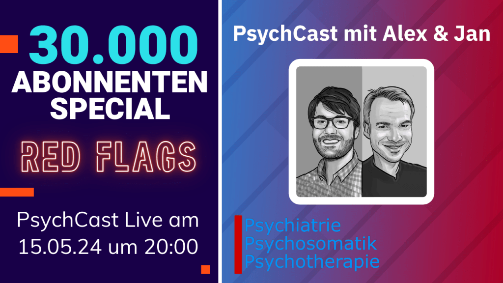 | Wir feiern gemeinsam die 30.000 treuen PsychCast-Abonnenten mit einer YouTube Live Sendung am Mittwoch, den 15.05.24 um 20:00. Alex und Jan sprechen über Red Flags in der Psychiatrie, Psychosomatik und Psychotherapie! Sei live dabei und beteilige Dich mit Fragen, Anregungen und eigenen Beiträgen! Hier ist der Link zum Live-Stream! |