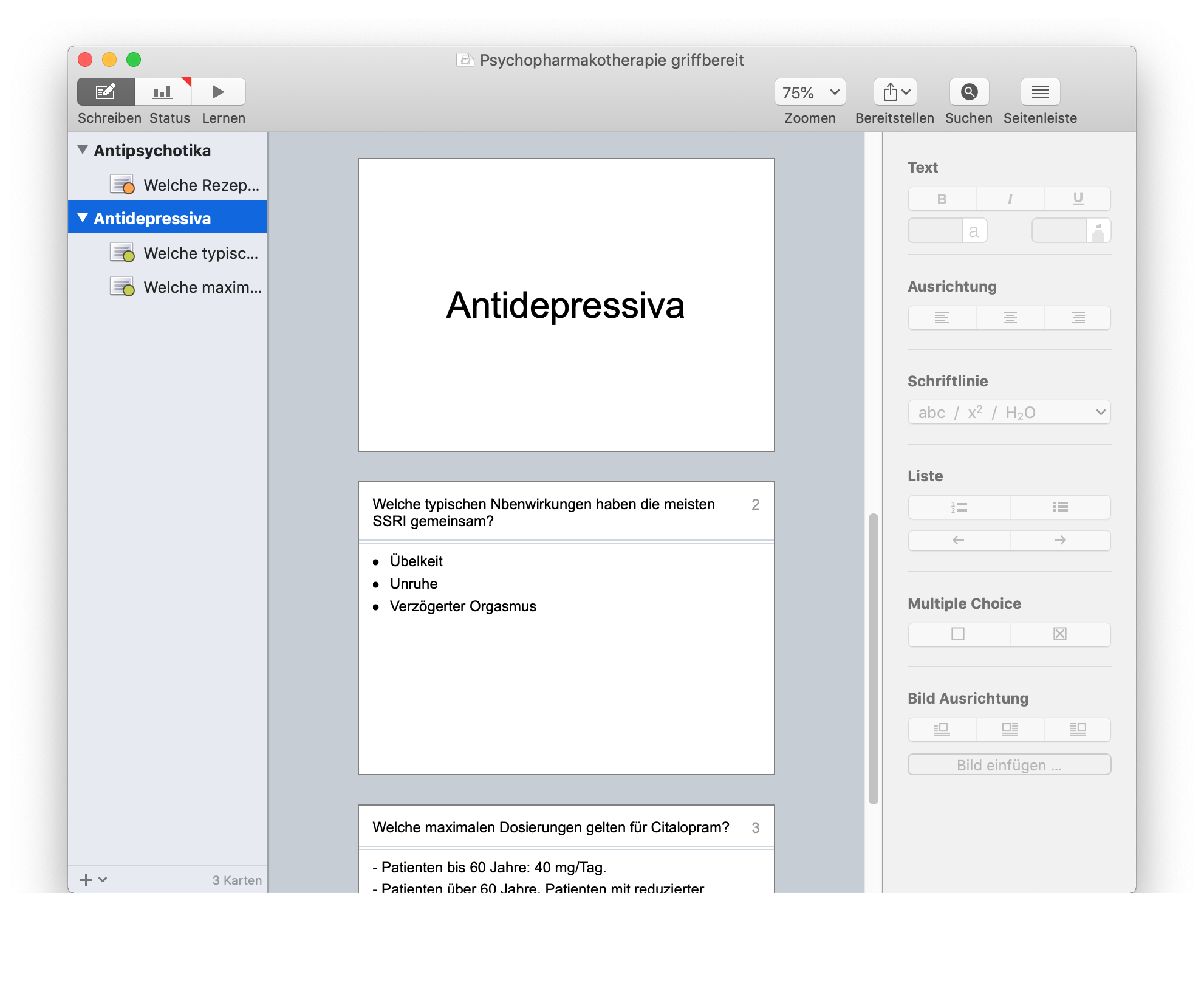 Um ehrlich zu sein, habe ich überlegt, für das Buch Psychopharmakologie griffbereit Lernkarten zu erstellen und den Lesern zur Verfügung zu stellen. Allerdings bin ich mir nach einigen Versuchen bewußt geworden, dass für jeden Leser andere Informationen relevant sein können und dass man wesentlich mehr lernt, wenn man sich die Mühe macht, seine Karten selbst zu erstellen. Wobei, als kurzes Repetitorium hätte es schon was…
