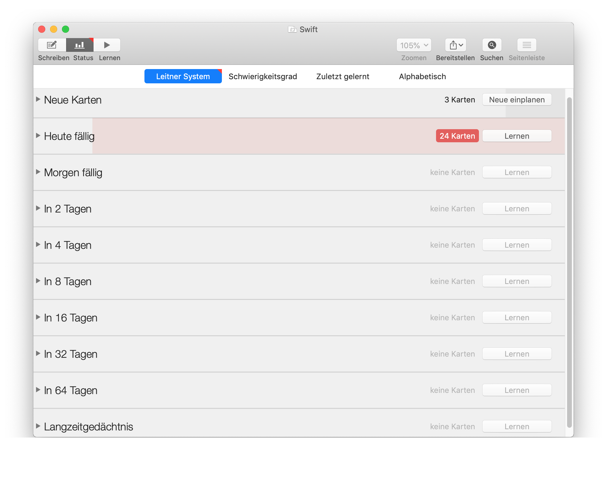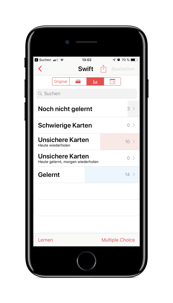 - Die App muss nach dem Leitner-System vorgehen, also Karten, die man schon kann, seltener abfragen.