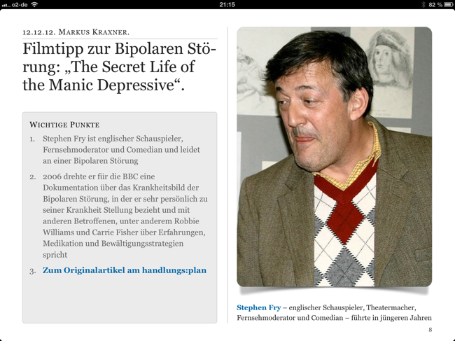 Ein Kapitel verweist auf eine Dokumentation, die der von einer bipolaren Krankheit betroffene Fernsehmoderator und Comedian Stefan Frey gedreht hat. Sehr sehenswert.
