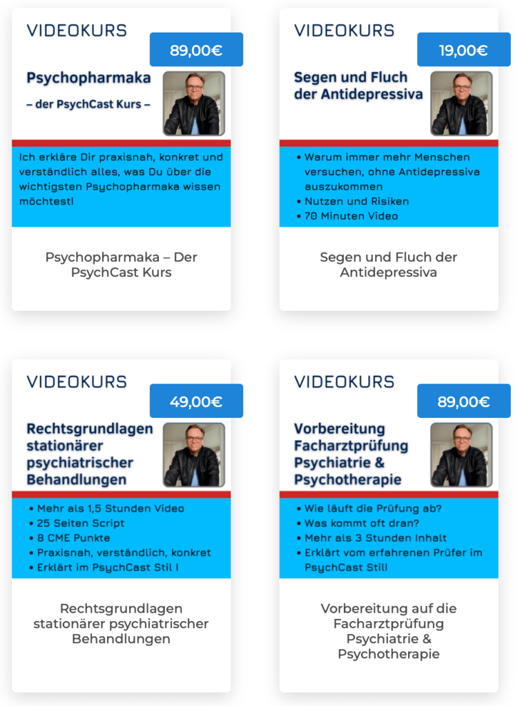 Ich habe für die Themen Psychiatrie | Psychopharmakologie | Psychotherapie den neuen Podcast „PsychCast unterwegs“ erstellt. Hier besuche ich interessante Gesprächspartner und teile meine Eindrücke. Auf Apple Podcasts findest Du den PsychCast unterwegs hier.