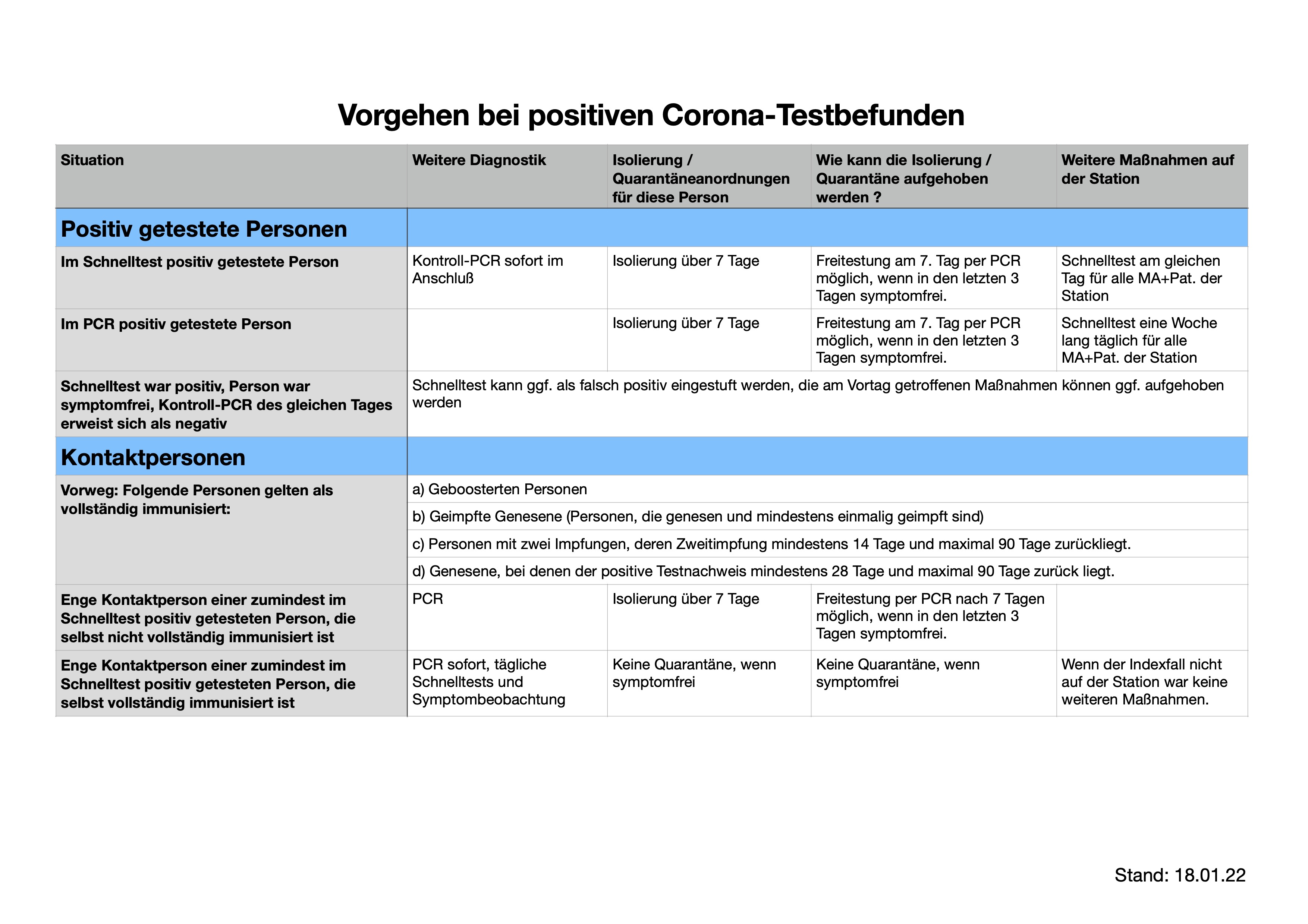 Wenn ein Patient oder ein Mitarbeiter einer Station positiv auf das Corona-Virus getestet worden ist, kann es sein, dass das Gesundheitsamt eine Kohortenisolierung für diese Station empfiehlt oder auferlegt. Keine Panik, die Station unterscheidet sich dann aktuell kaum von anderen Stationen. Allerdings sollen bis zum Ende der Maßnahme keine Aufnahmen auf die Station erfolgen und keine Verlegungen auf eine andere Station erfolgen. Es sollen auch keine Verdachtsfälle aufgenommen werden, die Patienten einer kohortenisolierten Station durchleben eigentlich das gleiche wie ein Haushalt in häuslicher Isolierung. Bei jeder Patient:in soll zwei Mal am Tag die Temperatur gemessen werden, auf das Auftreten von Husten oder Erkältungssymptomen soll geachtet werden, wenn eines dieser Symptome auftritt, dann Rachenabstrich-PCR machen. Von offenen geführten kohortenisolierten Stationen dürfen sich Patient:innen entlassen lassen, ihnen wird dann die häusliche Isolierung empfohlen. Das Pflegepersonal ist nicht isoliert und darf sich nach dem Dienst zuhause so verhalten, wie jeder andere auch, wobei Umsicht besonders empfohlen ist. Es ist nicht erforderlich, dass jede:r auf der Station einen Mundschutz trägt. Dies schadet zwar nichts, und wenn Mundschütze wieder besser verfügbar sind, kann man hier vielleicht andere Empfehlungen geben, aktuell aber nicht.